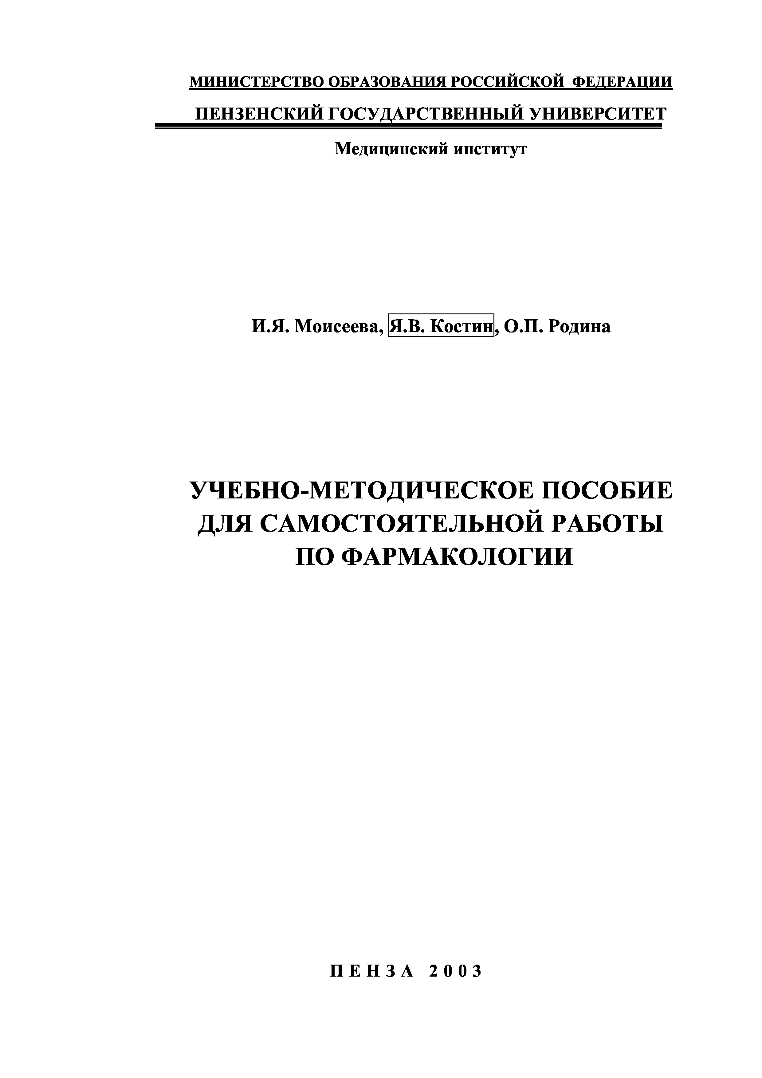 "Учебно-методическое пособие для самостоятельной работы по фармакологии" - читать интересную книгу автора (Моисеева И.Я., Костин Я.В., Родина О.П.) |