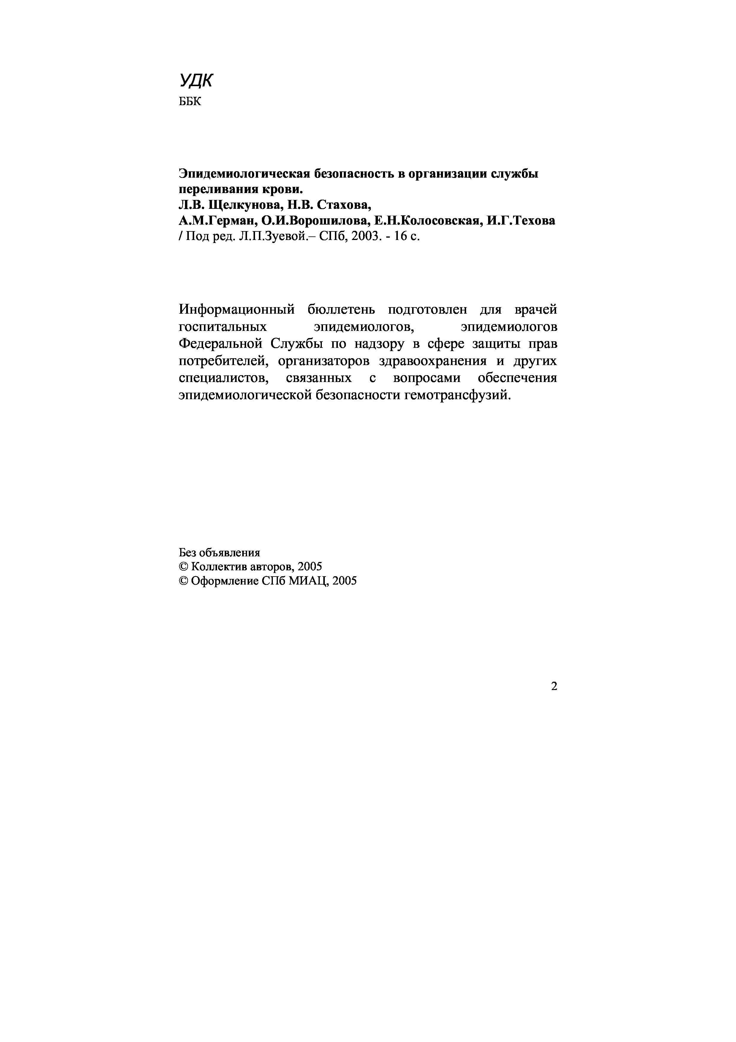 "Эпидемиологическая безопасность в организации работы службы переливания крови. Информационный бюллетень" - читать интересную книгу автора (Щелкунова Л.В., Стахова Н.В., Герман А.М. и др.)