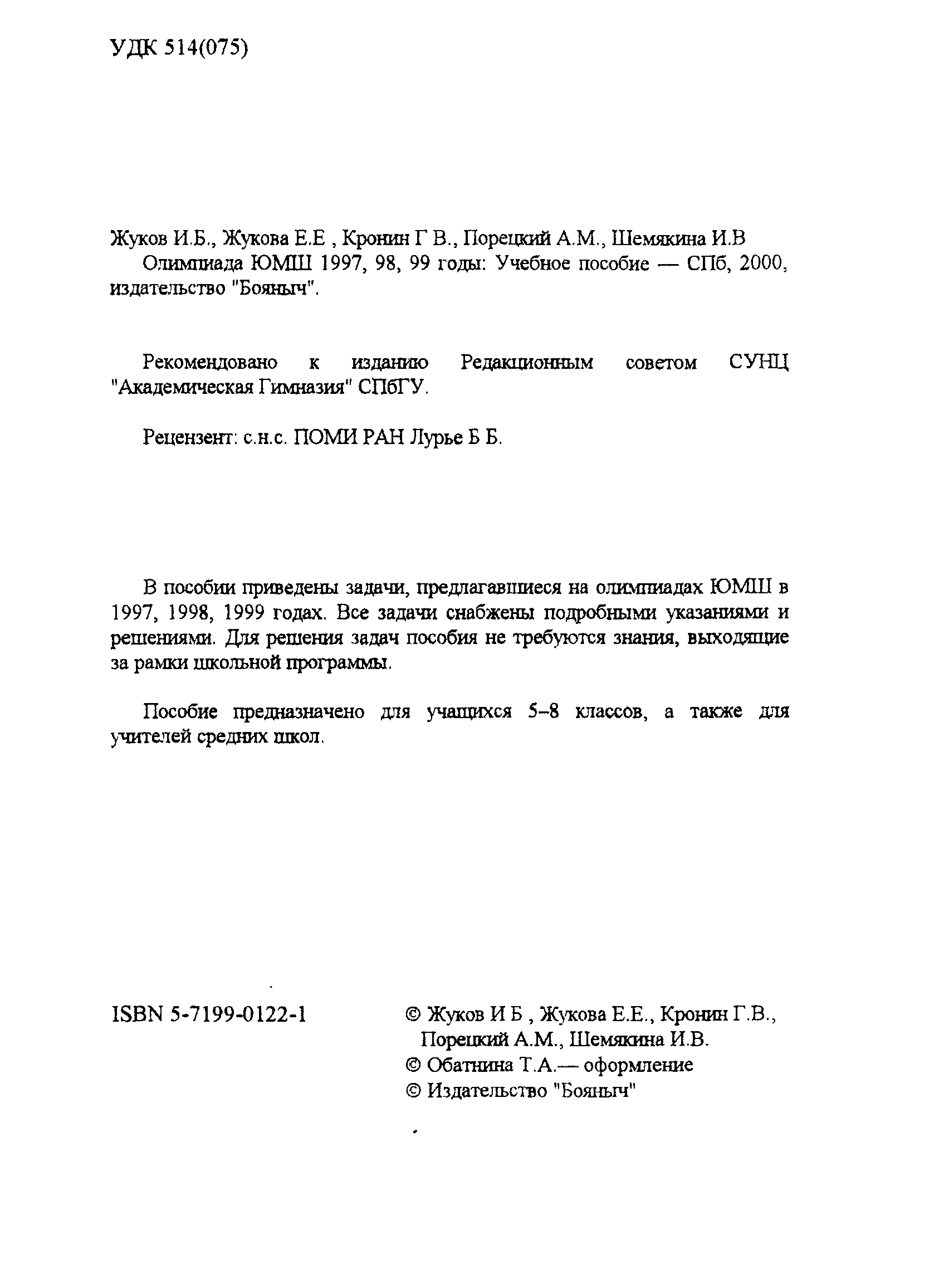 "Олимпиада ЮМШ 1997, 98, 99 годы: Учебное пособие" - читать интересную книгу автора (Жуков И.Б., Жукова Е.Е., Кронин Г.В.) |