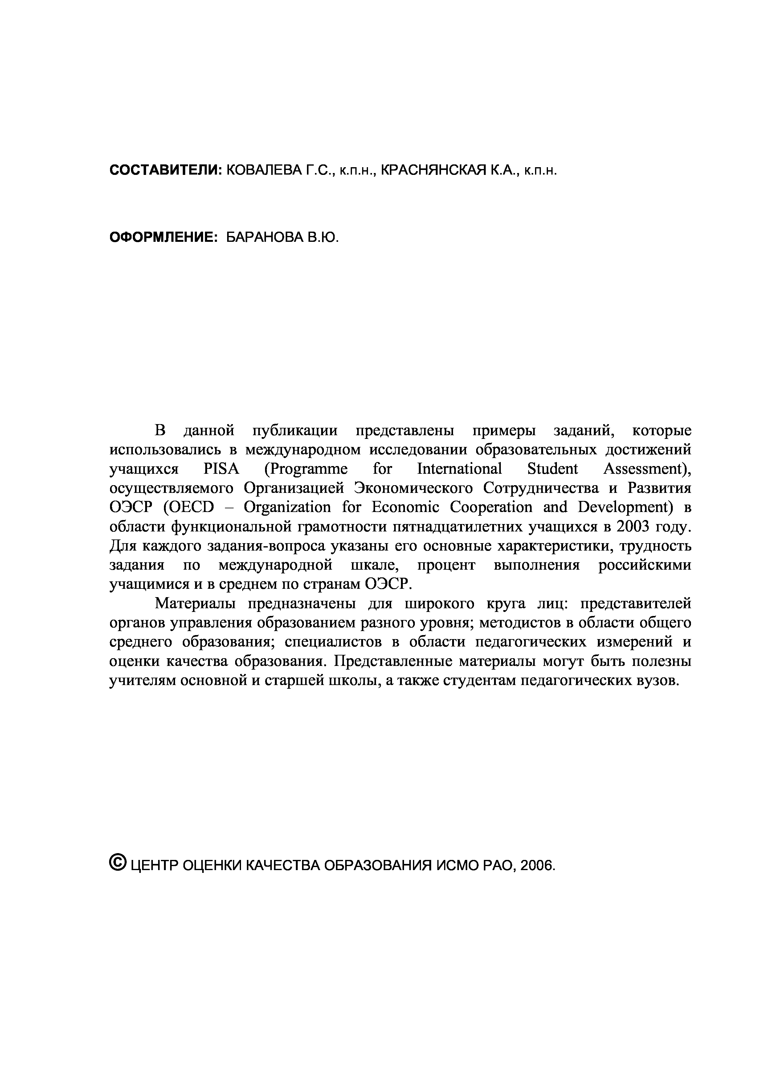 "Международная оценка образовательных достижений учащихся (Programme for International Student Assessment - PISA): Примеры заданий по математике" - читать интересную книгу автора (Ковалева Г.С., Краснянская К.А. Центр оценки...)