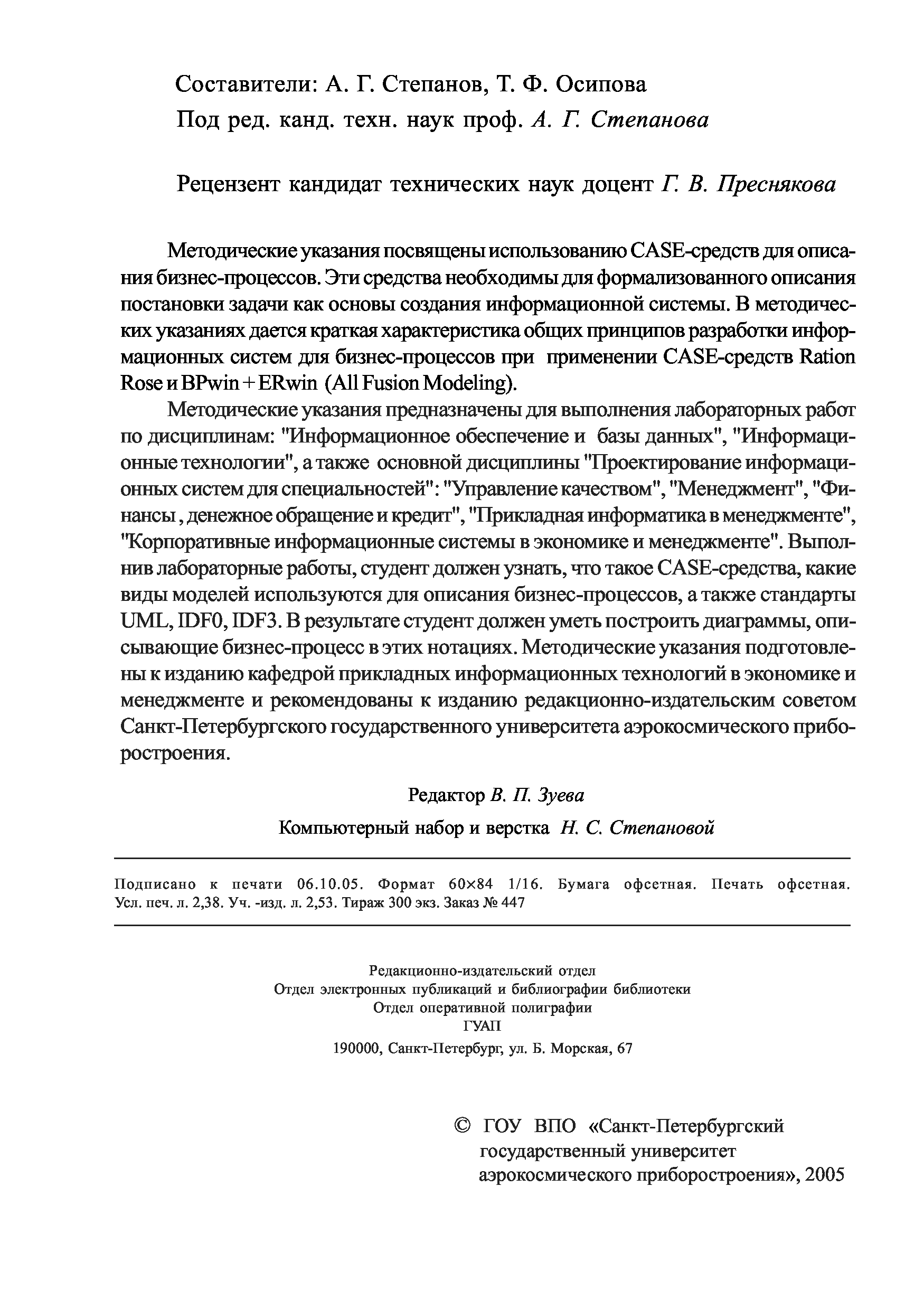 "Информационные системы. Использование CASE-средств при описании бизнес-процессов: Методические указания к выполнению лабораторных работ N1-7" - читать интересную книгу автора (Степанов А.Г., Осипова Т.Ф.) |