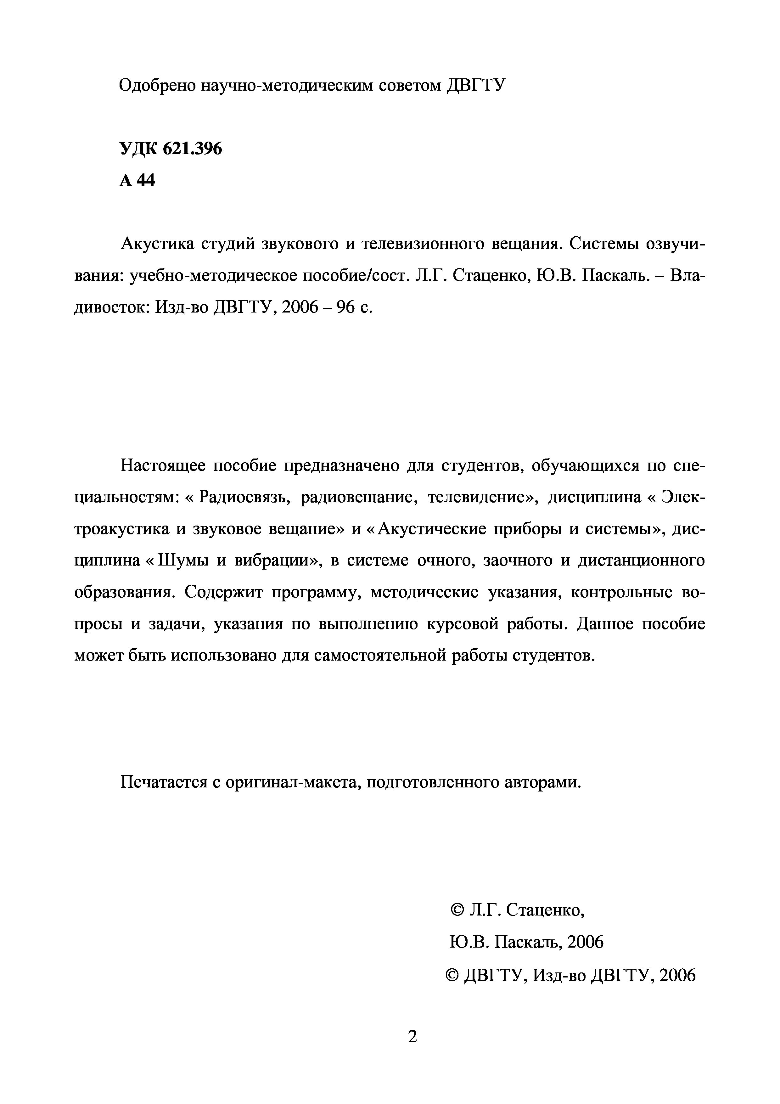 "Акустика студий звукового и телевизионного вещания. Системы озвучивания: Учебно-методическое пособие" - читать интересную книгу автора (Стаценко Л.Г., Паскаль Ю.В.) |
