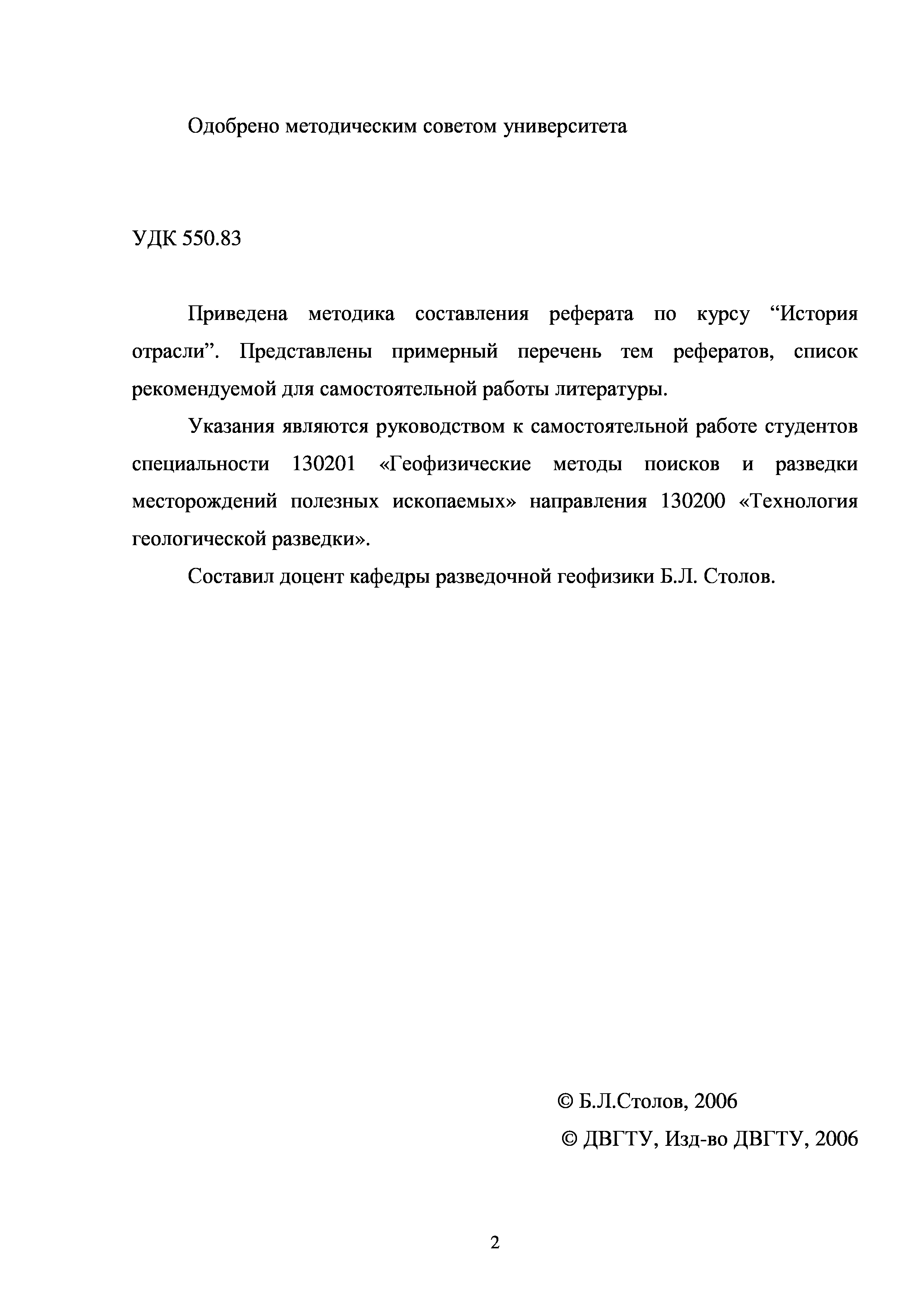 "История отрасли: Методические указания к составлению реферата для студентов специальности ''Геофизические методы поисков и разведки месторождений полезных ископаемых''" - читать интересную книгу автора (Столов Б.Л.)