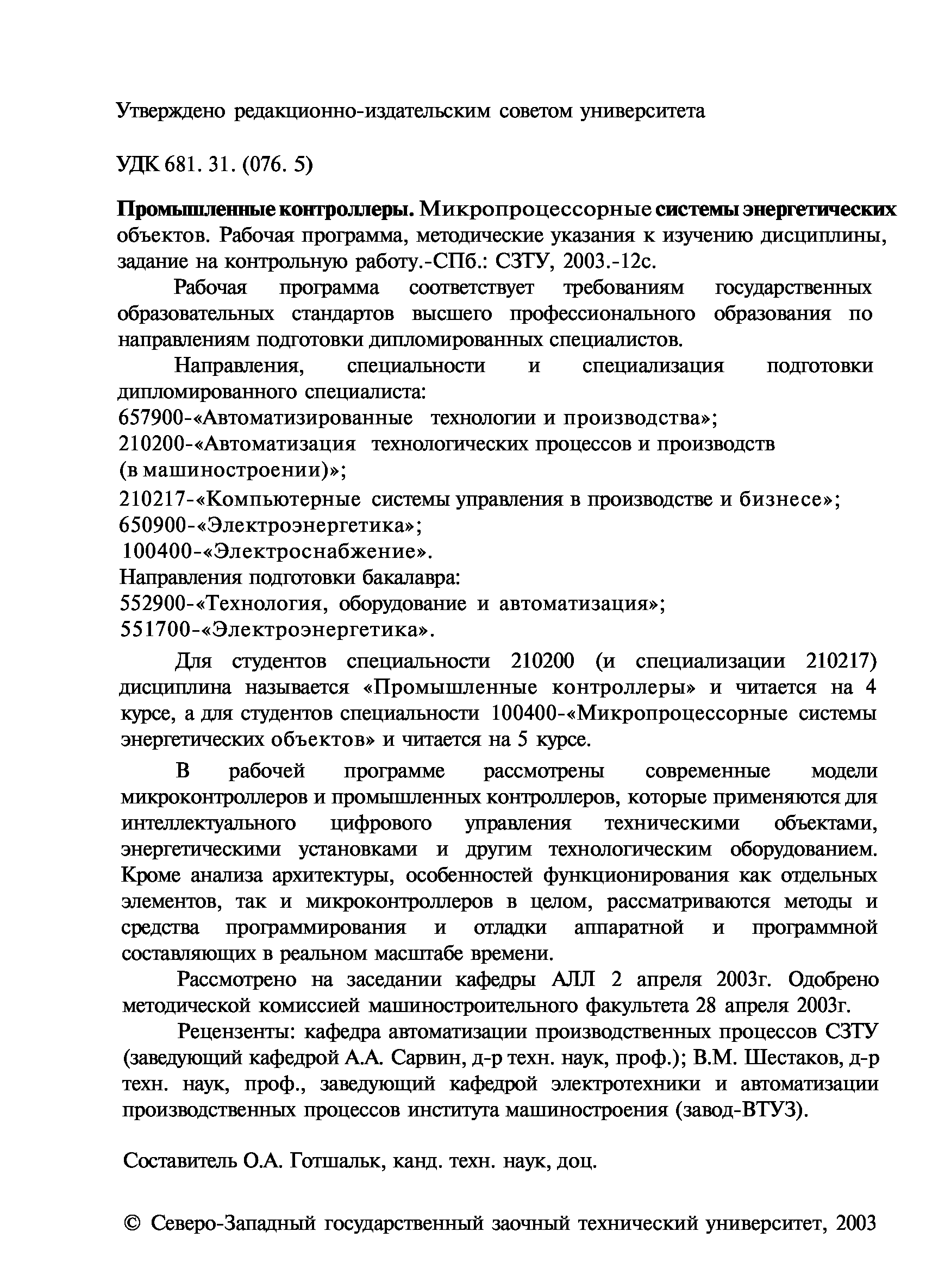 "Промышленные контроллеры, микропроцессорные системы энергетических объектов: Рабочая программа, методические указания к изучению дисциплины, задания на контрольную работу" - читать интересную книгу автора (Готшальк О.А.) |