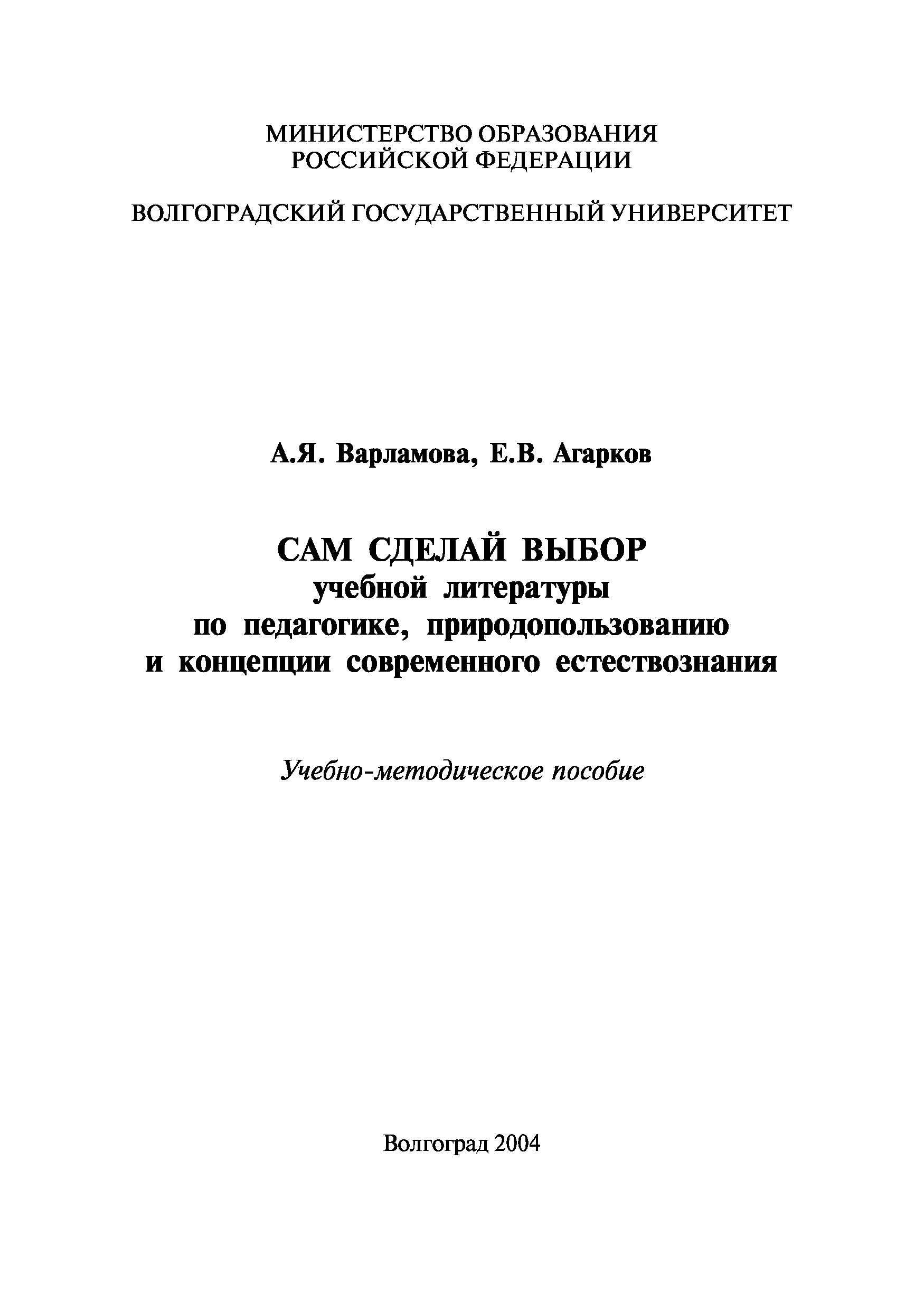 "Сам сделай выбор учебной литературы по педагогике, природопользованию и концепции современного естествознания: Учебно-методическое пособие" - читать интересную книгу автора (Агарков Е.В., Варламова А.Я.) |