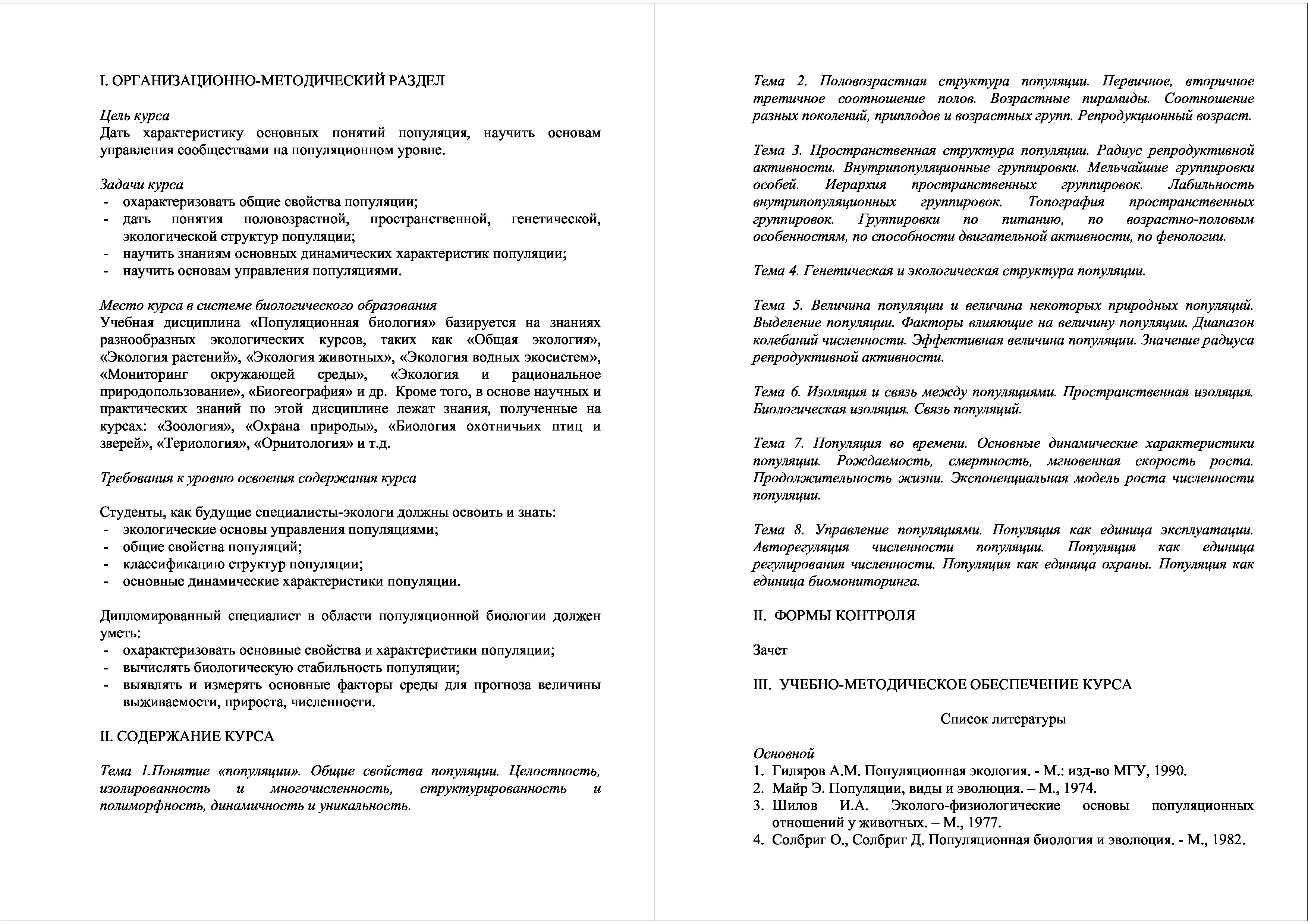 "Популяционная биология: Рабочая программа дисциплины для специальности 013100 ''Экология''" - читать интересную книгу автора (Беляков А.В.) |