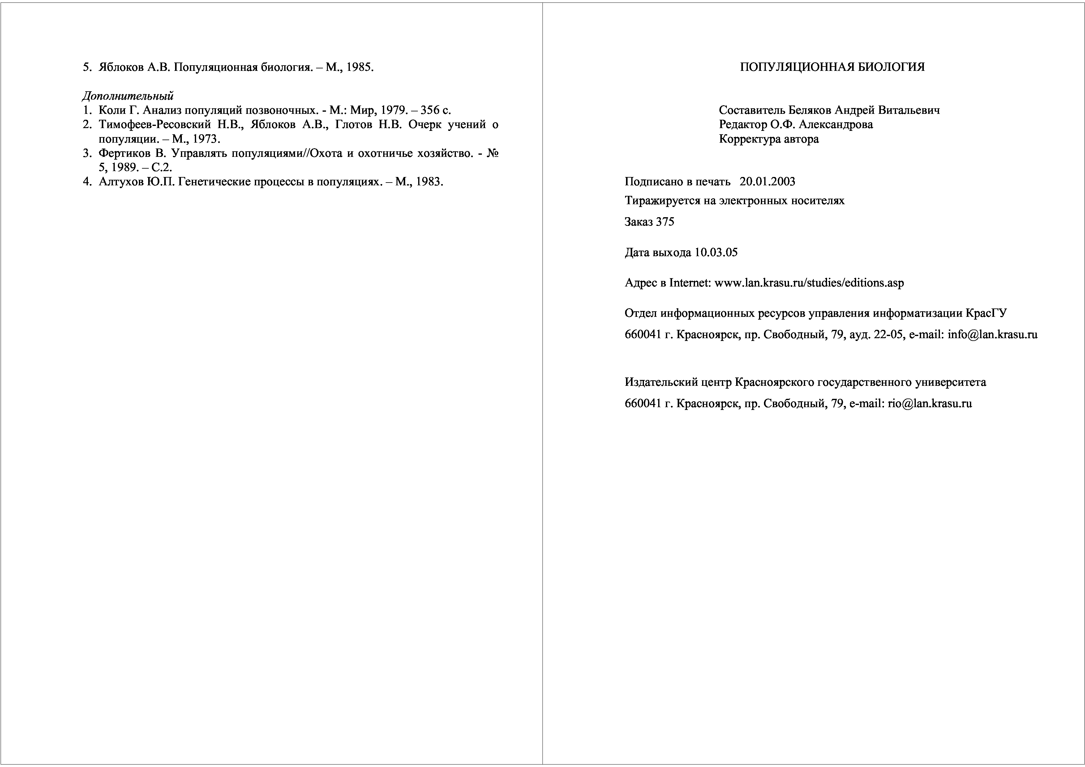 "Популяционная биология: Рабочая программа дисциплины для специальности 013100 ''Экология''" - читать интересную книгу автора (Беляков А.В.) |