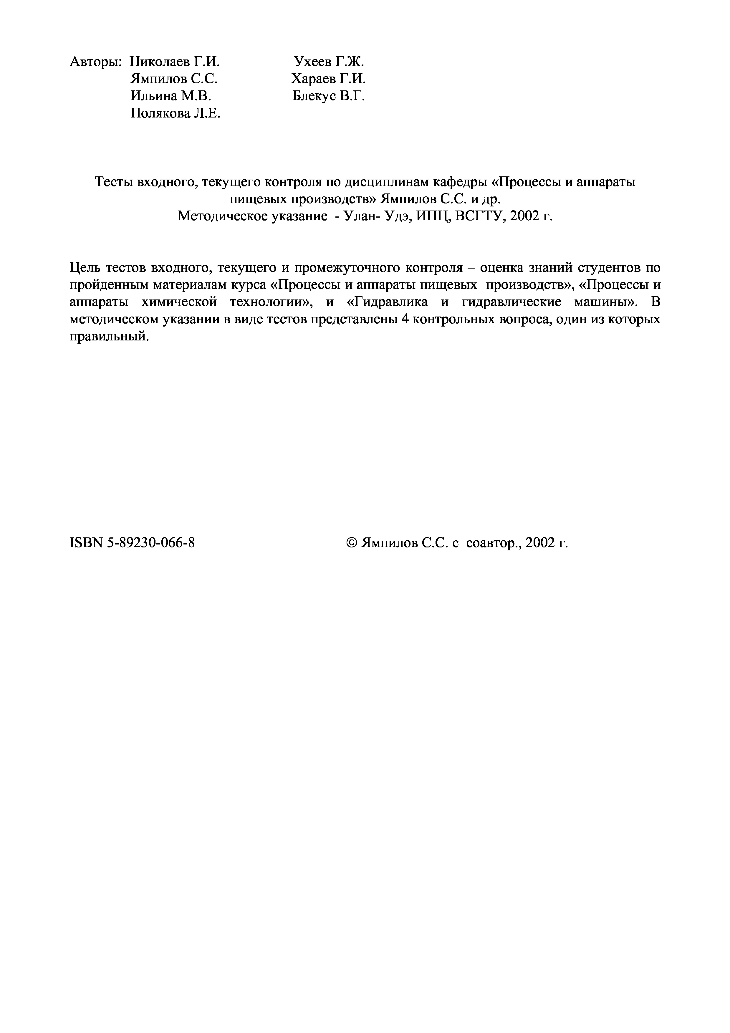 "Тесты входного, текущего контроля по дисциплинам кафедры ''Процессы и аппараты пищевых производств''" - читать интересную книгу автора (Николаев Г.И., Ямпилов С.С., Ильина М.В.,...) |