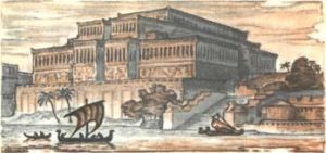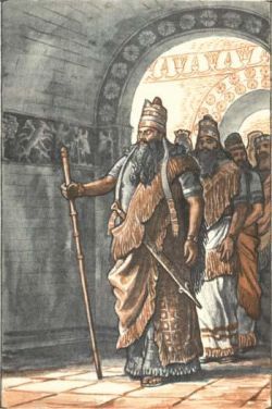 Если всмотреться в сложный узор вышивки, то можно отчетливо увидеть целые сцены религиозных обрядов: вот царь поклоняется священному дереву, вот подносит лук и стрелы божествам, а рядом – сцена борьбы царя с двумя крылатыми сфинксами… Волосы царя надушены и расчесаны. В ушах – золотые серьги, на руках – браслеты. Золотое ожерелье и меч в красивых ножнах дополняют его наряд. Рядом с ним – его сыновья, в таких же дорогих одеждах, но с менее богатыми украшениями. Царь жестом дает понять, что пора приступать к священнодействию. Шумукин делает знак. Ему подают большой острый нож и укладывают ягненка на каменный жертвенник. Другой жрец, став на колени перед статуей Шамаша, начинает читать вопросы, продиктованные царем и записанные на глиняной табличке: – «…Шамаш, великий владыка, на то, о чем я тебя вопрошаю, дай мне верный ответ. С этого дня, с третьего дня этого месяца айяра, на сто дней и сто ночей срок совершения гадания. В течение этого срока – будь то войско киммерийцев, урартов, мидян, будь то какой бы то ни было враг – задумают ли они, замышляют ли они? Будь то осадой, будь то силой, будь то боевым действием, битвой и сражением – возьмут ли они города наши, покорят ли наши владения?.. Шамаш, великий владыка, на то, о чем я тебя вопрошаю, дай мне верный ответ…» В это время Шумукин шепчет молитву и заносит над ягненком нож. Дымящаяся печень в его руках. Шумукин долго рассматривает ее. Он должен дать ответ на гадание. Еще не все вопросы заданы богу Шамашу. Жрец торопится. Нужно еще узнать у бога, состоится ли сговор со скифским царем Бартатуа. Он прислал к царю Асархаддону гонцов: просит отдать ему в жены царскую дочь. При этом Бартатуа обещает Ассирии мир и дружбу, помощь против врагов. – Верно ли это? – вопрошает бога обеспокоенный Асархаддон. Царевич Ашшурбанипал безмолвно наблюдает за обрядом жертвоприношения. Настанет день, когда он также обратится к богу Шамашу и спросит совета у владыки вселенной. Будет ли он жрецом, как хочет этого отец, или станет наследником престола – молитвы богу Шамашу всегда будут нужны. Грозный Шамаш требует многих жертв и молитв. Он мстит, когда его забывают. Закончив чтение табличек с запросами богу Шамашу, жрец бережно складывает их, чтобы потом унести в царскую библиотеку. Там они будут храниться в назидание потомству. Быть может, сыновья и внуки царя пожелают узнать мысли Асархаддона – тогда они прочтут эти таблички. Сотни таких табличек хранят разные распоряжения царя, проклятия врагам, молитвы и заклинания, речи перед иностранными послами, военные приказы, письма. Шумукин долго шепчет молитвы над дымящейся печенью, прежде чем решается дать ответ. Наконец он обращается к царю: – Я вижу благоприятные начертания, я вижу добрые предсказания. Великий Шамаш предсказывает победу в походах твоих. Владыке вселенной Шамашу угодна твоя достойная жертва. Да будет мир и благополучие над землями Ассирии! Гадание закончено. Служитель открывает тяжелые бронзовые двери, и ослепительный поток света врывается в полутемный зал, наполненный дымом курений и копотью светильников. Исчезают длинные, мрачные тени, и словно оживают увешанные щитами стены. Золотые щиты, украшенные головами собак, чередуются с серебряными, на которых изображены головы драконов, львов и туров. Это прекрасные изделия урартских мастеров. Когда-т