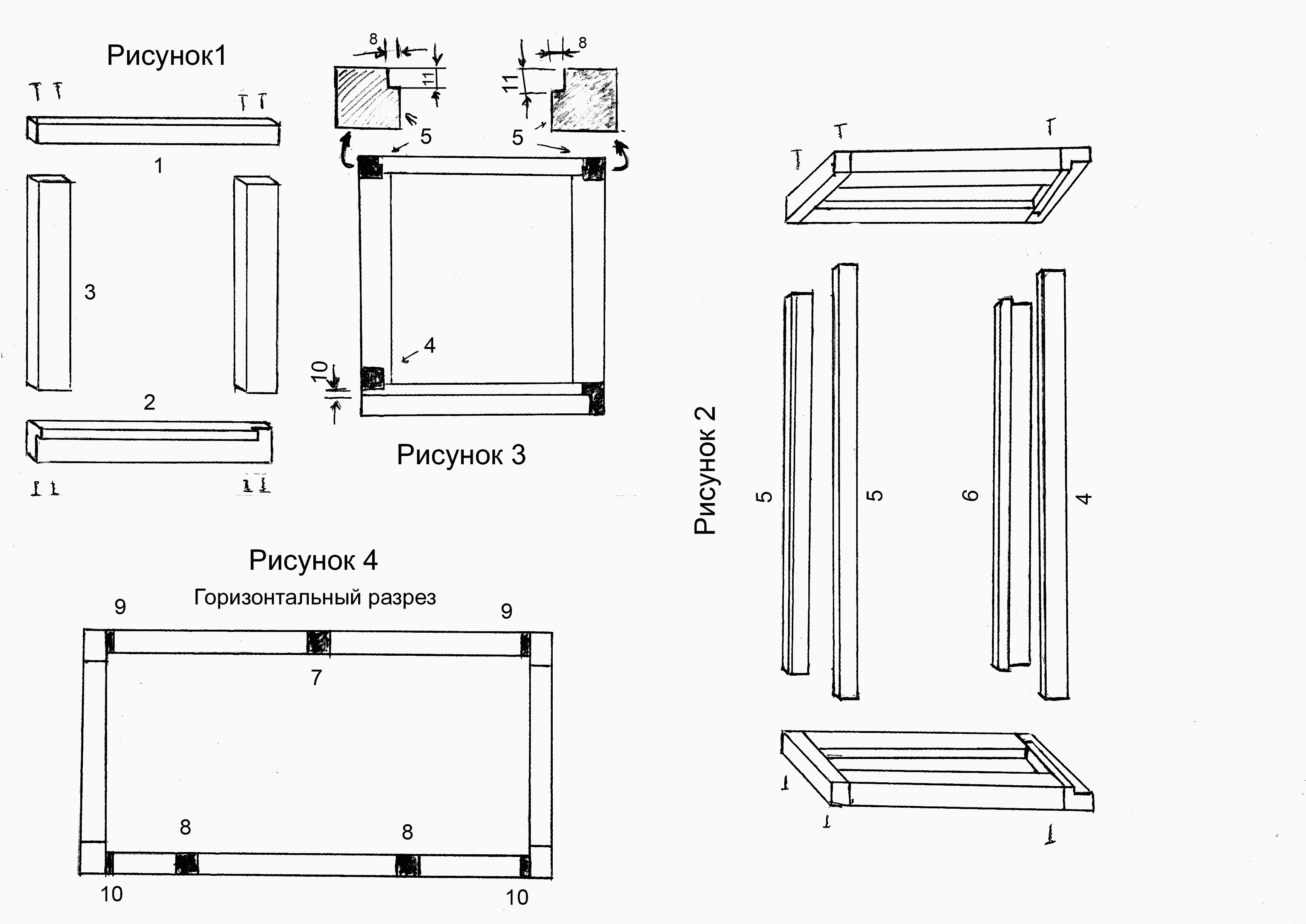 Рисунок 1. Собираем боковые стенки каркаса. Детали 2 и 3 имеют сечение 50х70, деталь 1 50х45, на детали 2 отобрана четверть 11х50 для дна (после обшивки фанерой она станет 15х50); Рисунки 2 и 3. Соединяем боковые стенки горизонтальными брусками. Детали 4 и 5 имеют сечение 45х50 мм, деталь 6 – 50х70мм. На деталях 5 отобраны четверти 7х11 мм, о чём уже говорилось. На детали 6 отобрана четверть 11х50 для дна. Рисунок 4: вставляем вертикальные бруски в местах расположения летков на передней стенке, один на задней и бруски 20х50 по углам для крепления фанеры.