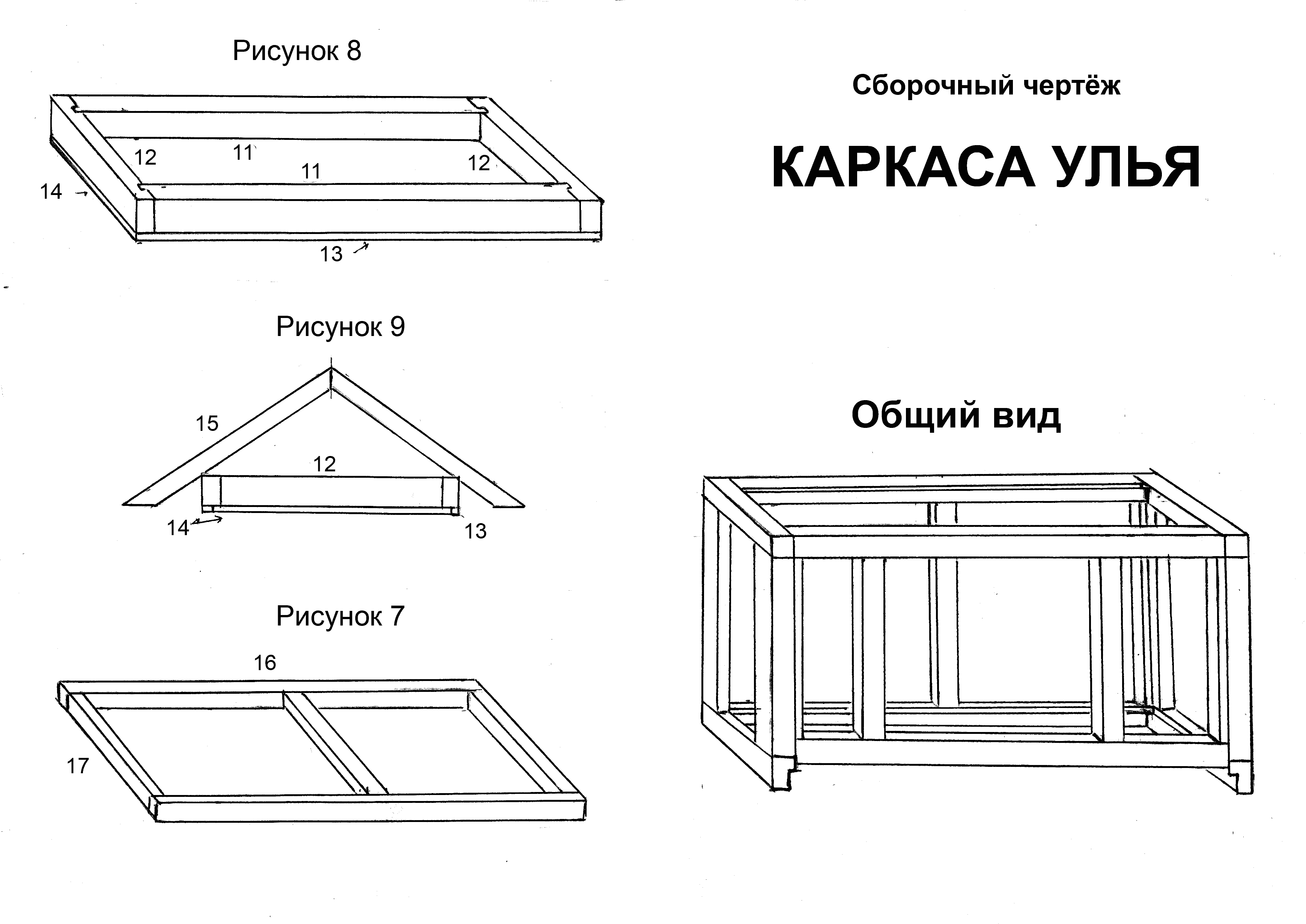Рисунок 7 – изготовление каркаса дна из брусков 40х40 мм. (прилётную дощечку я изготавливаю отдельно). Рисунок 8 – изготовление подкрышника (бруски 50х70); Рисунок 9 – монтаж стропил.